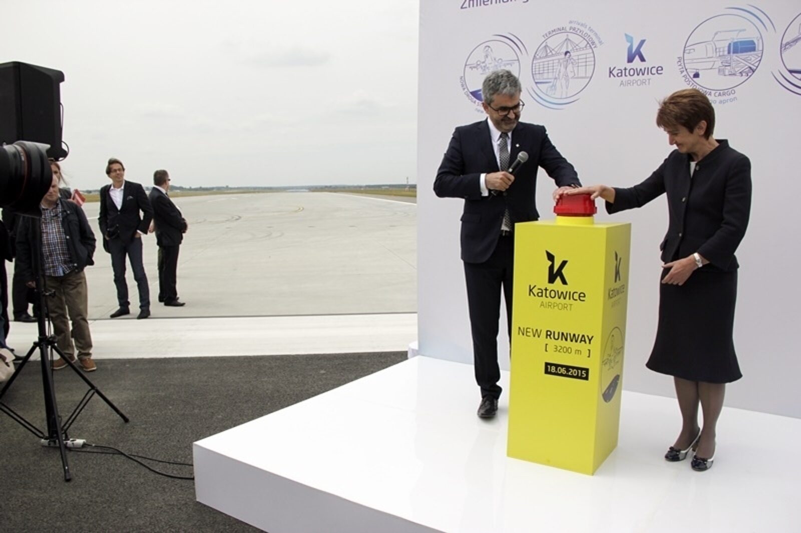 Prezes GTL Artur Tomasik i minister infrastruktury Maria Wasiak symbolicznie włączyli oświetlenie nowej drogi startowej
