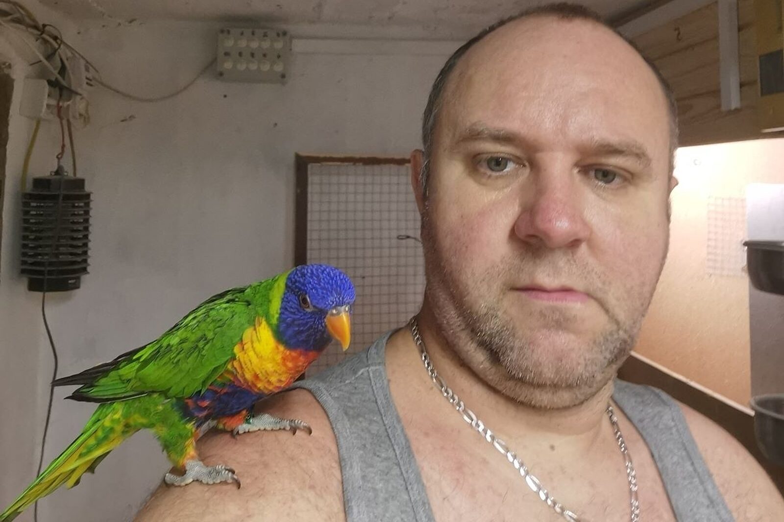 Paweł Walczak z jedną ze swych papug