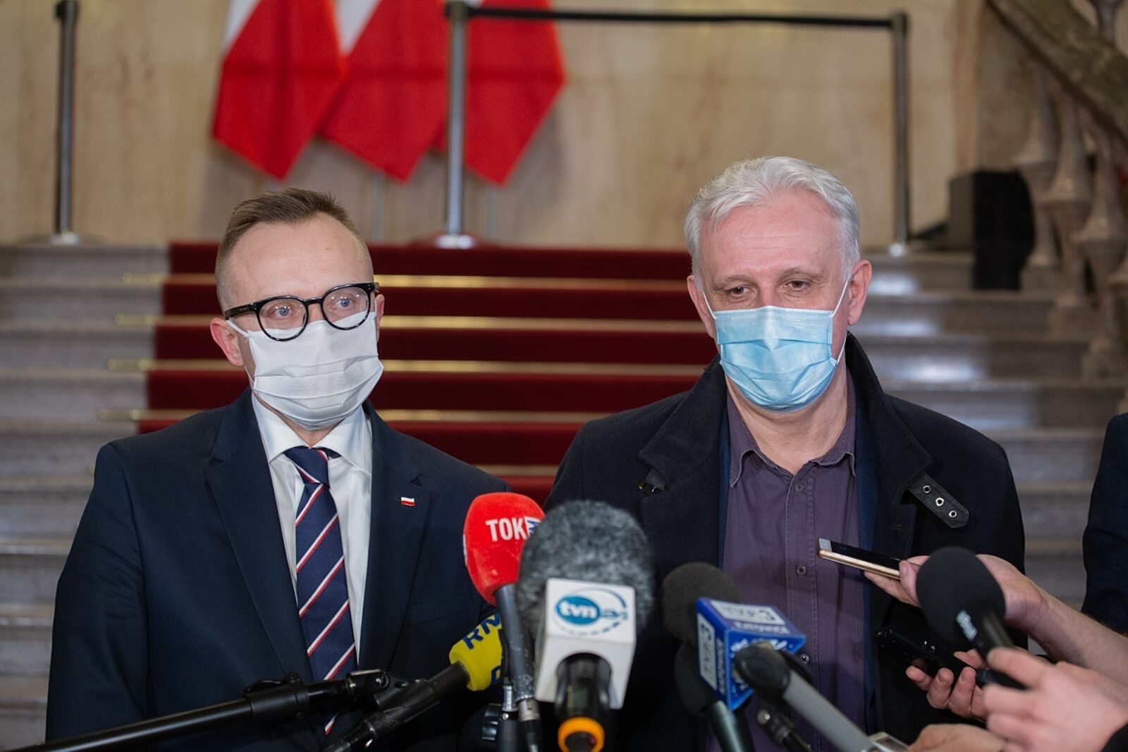 Artur Soboń, wiceminister aktywów państwowych, i Dominik Kolorz, szef śląsko-dąbrowskiej Solidarności, informują dziennikarzy o wynikach spotkania