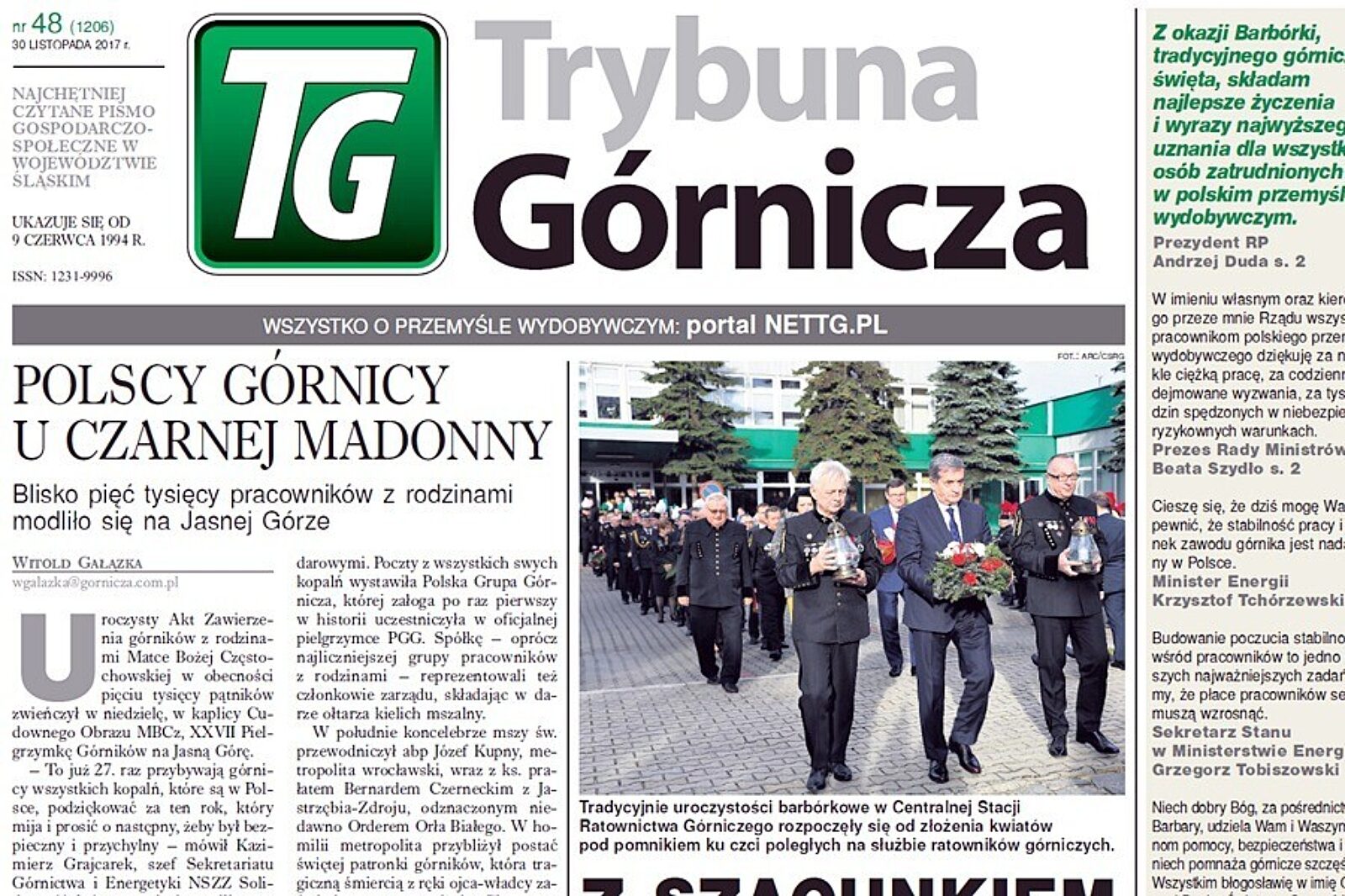 W czwartek, 30 listopada, w ręce naszych Czytelników oddamy wyjątkowy numer, przygotowany na nadchodzącą Barbórkę. Z tej racji w numerze nie zabrakło licznych życzeń. Przedstawicielom górniczego stanu składają je m.in.: prezydent Andrzej Duda, premier Beata Szydło, minister energii Krzysztof Tchórzewski, metropolita katowicki abp Wiktor Skworc, obszernie kondycję branży omawia wiceminister Grzegorz Tobiszowski.