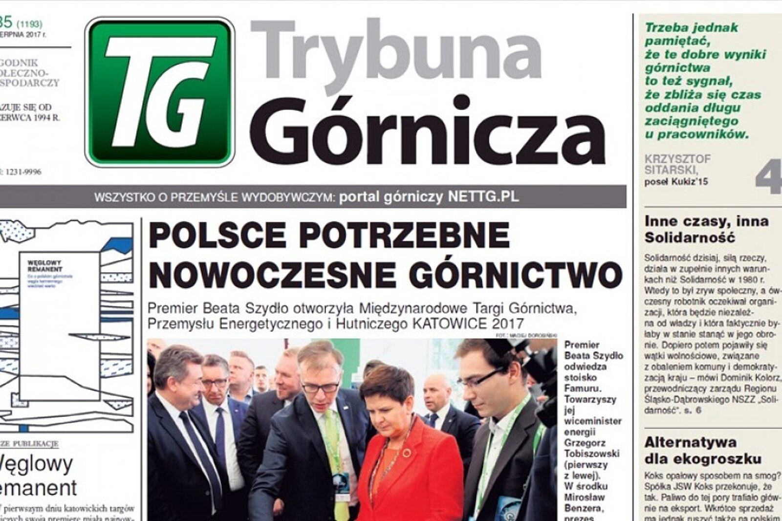 W czwartek (31 sierpnia) kolejne wydanie Trybuny Górniczej, a w nim obszerna relacja z otwarcia Międzynarodowych Targów Górnictwa, Przemysłu Energetycznego i Hutniczego KATOWICE 2017. W uroczystości uczestniczyła m.in. premier Beata Szydło oraz wiceminister energii Grzegorz Tobiszowski.