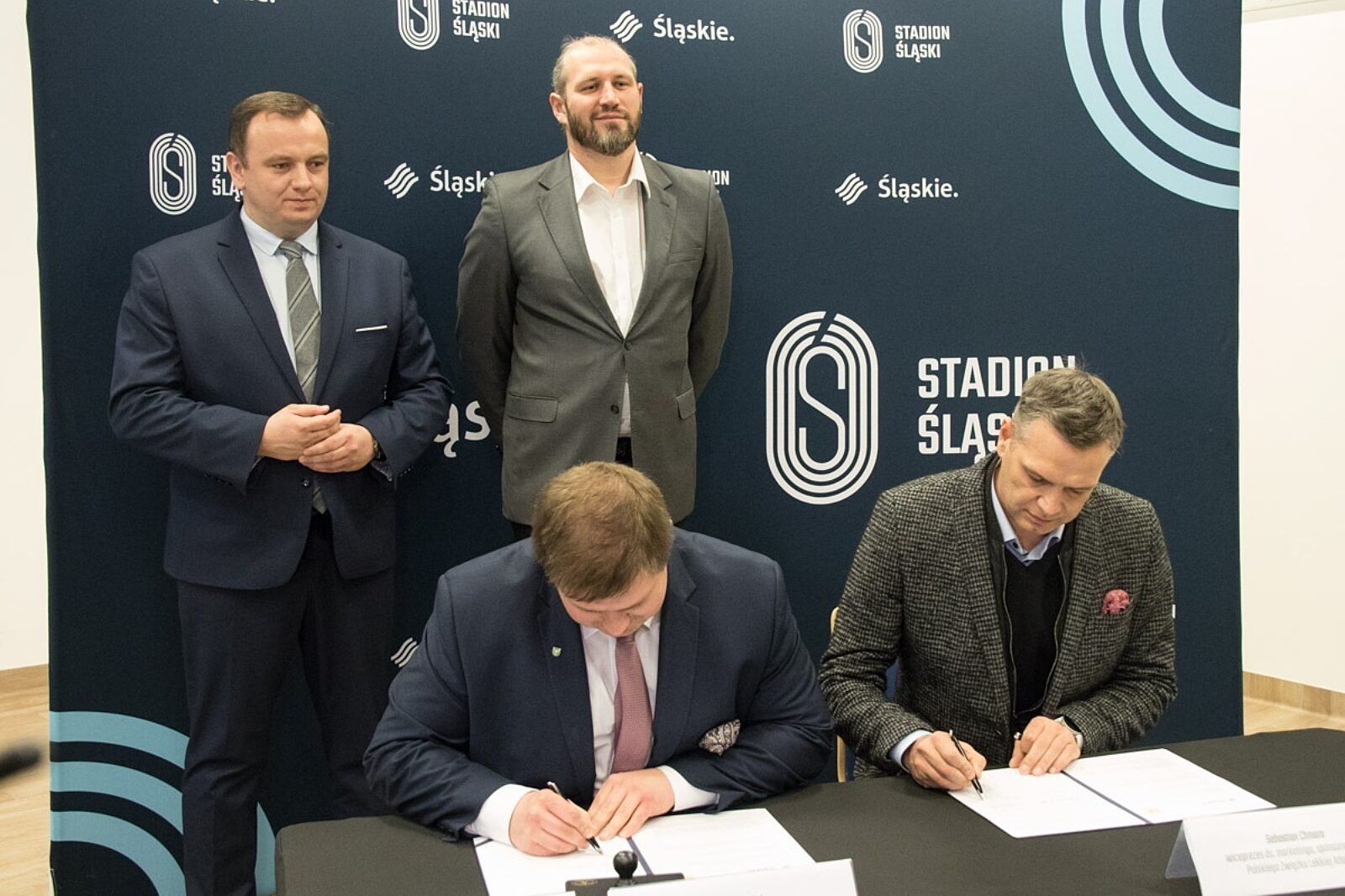 List popisali (od lewej) wicemarszałek Wojciech Kałuża, marszałek Jakub Chełstowski oraz wiceprezesi PZLA Tomasz Majewski i Sebastian Chmara