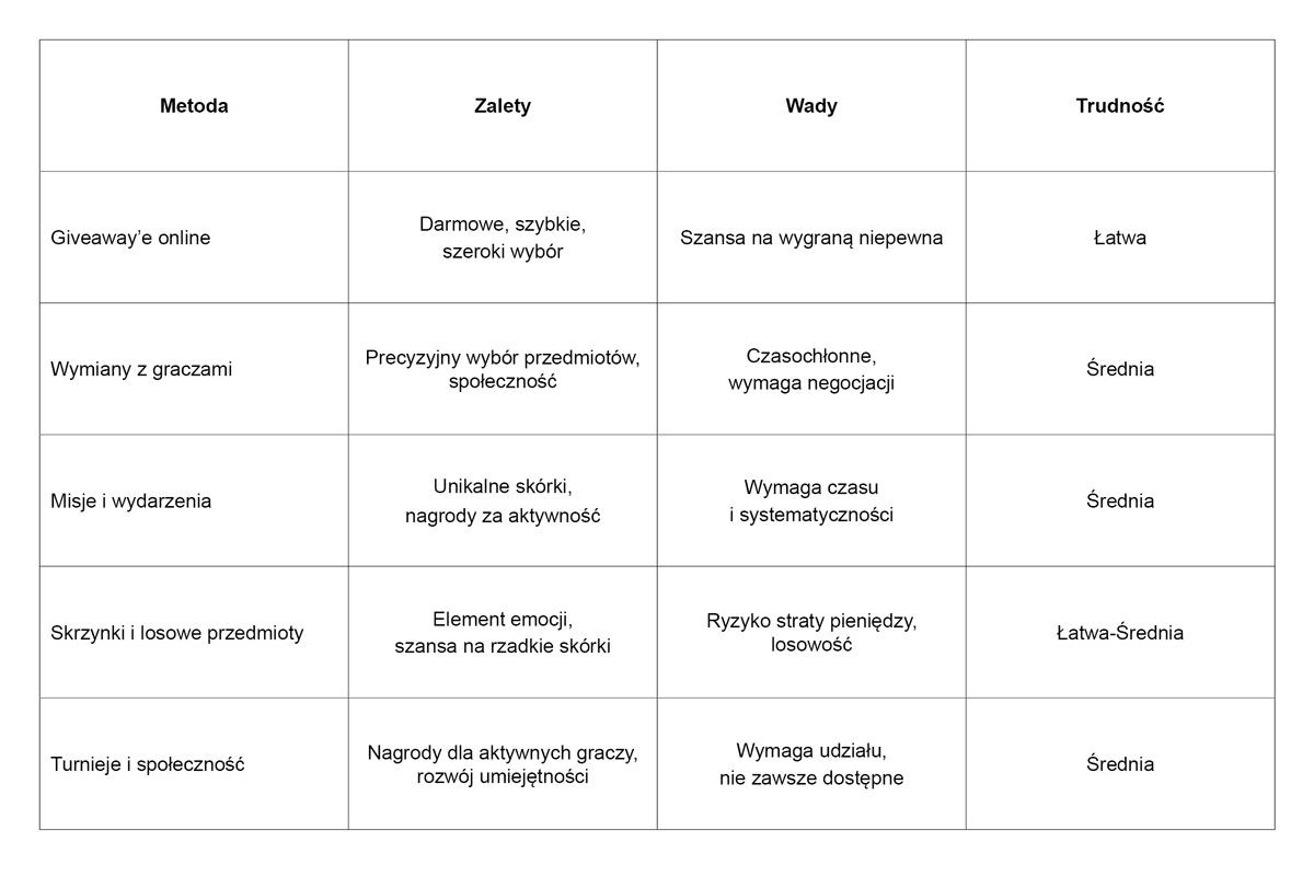 Tabela poniżej przedstawia porównanie głównych metod zdobywania skórek, w tym wymian: