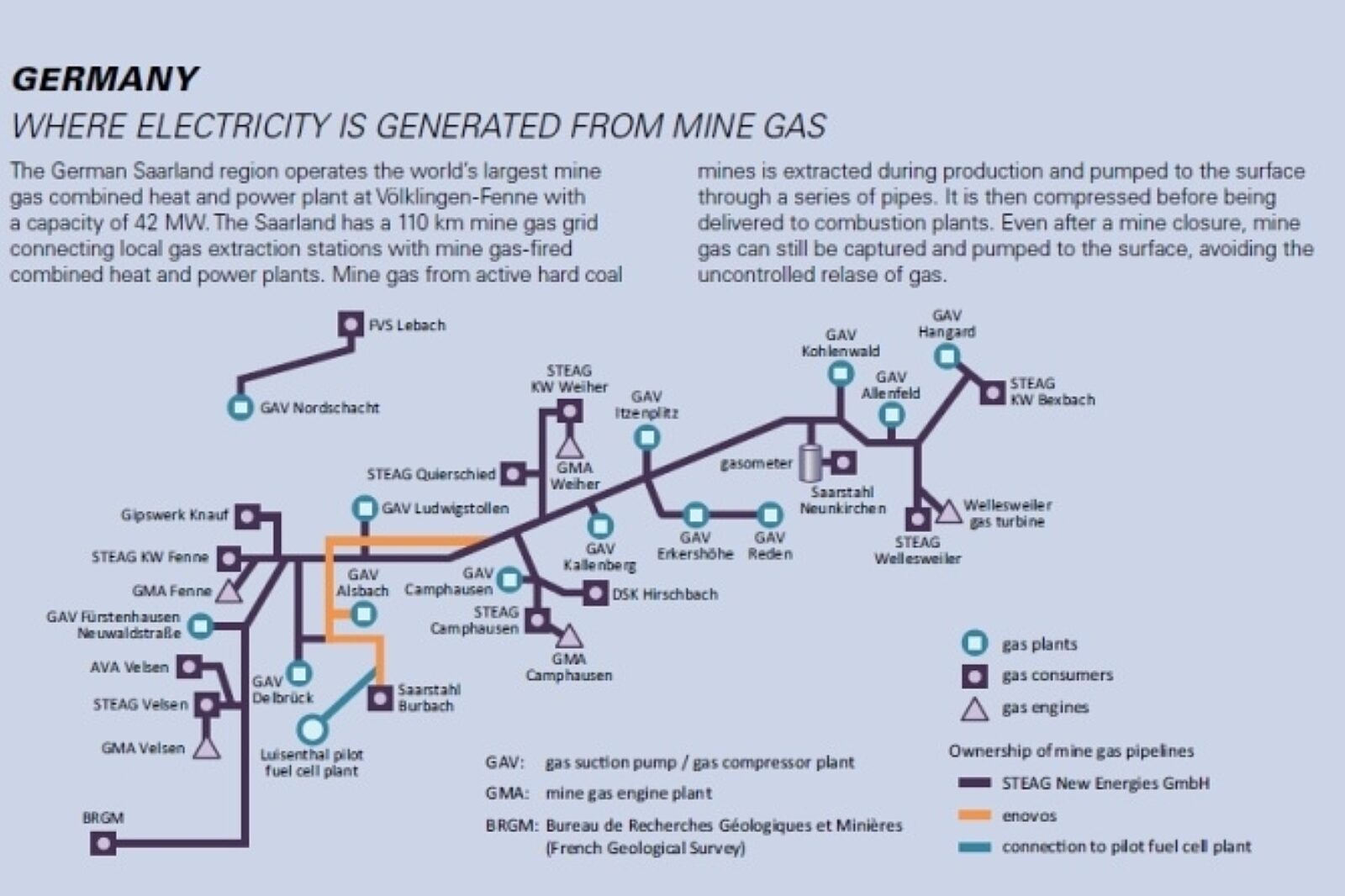 Sieć gazociągów długich na 110 km łączy lokalne kopalnie i stacje, wytwarzające gaz ziemny, z zakładami, które spalają go, produkując prąd i ciepło. Mieszaninę metanową pozyskuje się z czynnych kopalń węgla kamiennego w trakcie wydobycia, na powierzchnię tłoczona jest rurociągami. Po sprężeniu pod ciśnieniem gaz płynie rurami do palenisk w elektrociepłowniach. Nawet po zamknięciu kopalni węgla wciąż można wychwytywać metan i tłoczyć go na powierzchnię, co dodatkowo zabezpiecza teren przed niekontrolowanymi wyciekami gazu.