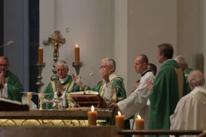 Przy ołtarzu wraz z metropolitą katowickim stanęli biskupi pomocniczy i proboszczowie parafii archidiecezji, w których pracują górnicy.