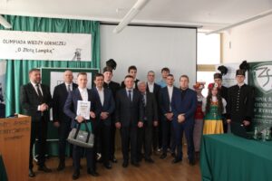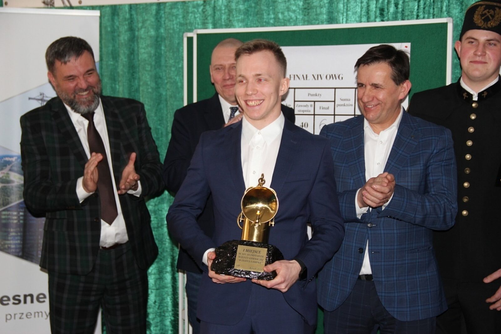 Uradowany Łukasz Kolarczyk, zwycięzca górniczej olimpiady, w towarzystwie zaproszonych gości i organizatorów, tuż po odebraniu wywalczonego trofeum