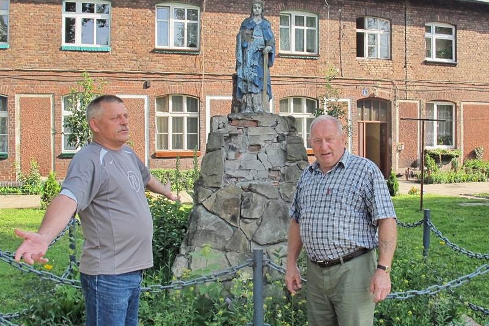 Można zrozumieć ich strapienie. Mierząca kilkadziesiąt centymetrów gipsowa postać św. Barbary w łuszczącej się szacie wygląda tak, jakby została dotknięta trądem. Patronce brakuje prawej ręki z kielichem. Stoi na skruszonym, nadgryzionym zębem czasu kamiennym cokole, w którym razi wyrwa po istniejącej w nim ongiś tablicy. Tylko otoczenie jest zadbane. Wokół posadzone kwiaty, równiutko przystrzyżony trawnik, a - według zapewnień obu emerytowanych górników - w każde święta, zwłaszcza na Barbórkę, u podnóża patronki płoną znicze.