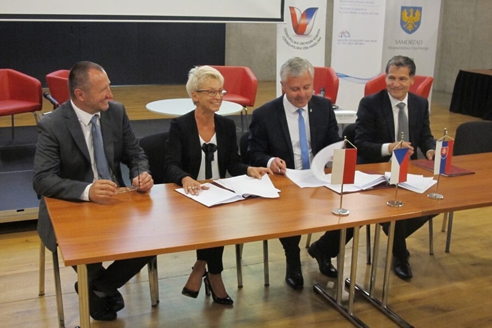 Memorandum na rzecz współpracy śląskich regionów Czech i Polski podpisali: Jan Krkoska, zastępca hetmana województwa morawsko-śląskiego, Małgorzata Ochęduszko-Ludwik, członek zarządu woj. śląskiego, Jan Unucka, zastępca hetmana województwa morawsko-śląskiego oraz Ladislav Gabco, członek samorządu województwa zlińskiego na Słowacji