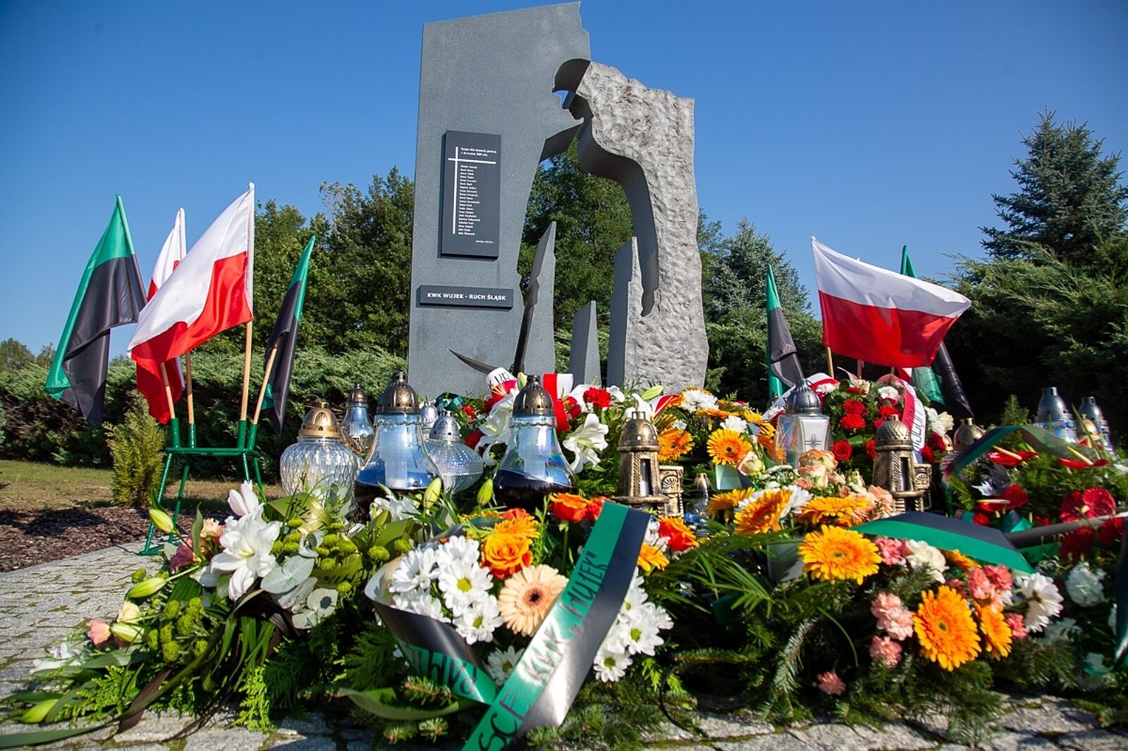 Górnictwo: Kwiaty i znicze pod pomnikiem upamiętniającym górników z ruchu Śląsk