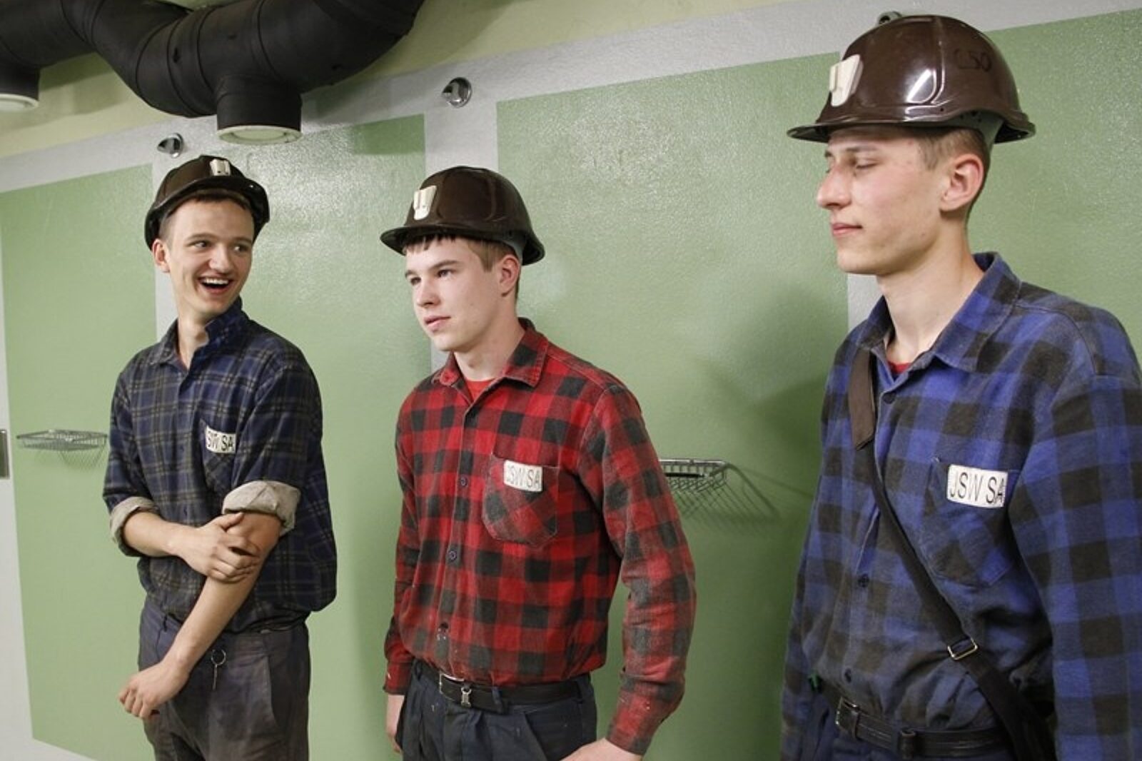 Aleksy Smyk, Marcin Wasilewski, Wiesław Marszołek, praktykanci górniczy w kopalni Pniówek, testują łaźnię bez kafli i chwalą zwłaszcza ciepłą w dotyku posadzkę