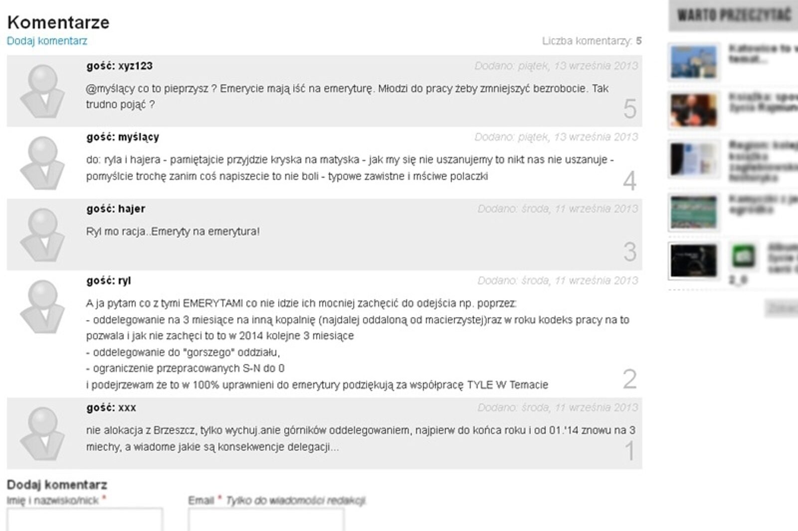 Internet swoje prawa ma. Ludzie już sporadycznie pisują listy do gazet. Zamiast tego komentują teksty i opisywane w nich wydarzenia ad hoc. Szczególnie gdy temat jest gorący, bo dotyczący albo emerytur górniczych, albo redukcji uprawnień górniczych lub zatrudnienia, albo też sytuacji w górnictwie - przede wszystkim wówczas, gdy dzieje się w nim nie najlepiej.