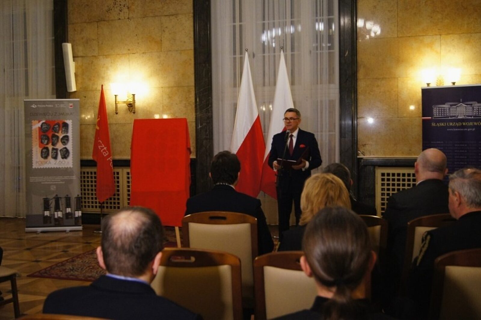 W Sali Marmurowej w siedzibie wojewody śląskiego zaprezentowano w piątek wieczorem nowy znaczek Poczty Polskiej ku czci górników z kopalni Wujek