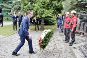Premier złożył również wieniec pod pomnikiem poległych w akcji ratowników górniczych pod budynkiem CSRG, a następnie wraz z towarzyszącymi mu osobami, m.in. z wiceministrem energii Adamem Gawędą i wojewodą śląskim, Jarosławem Wieczorkiem, zwiedzili zaplecze techniczne CSRG.
