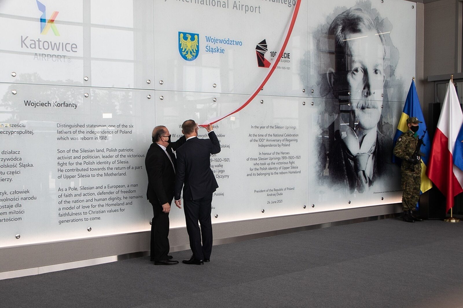 Odsłonięcia tablicy z podobizną Wojciecha Korfantego dokonali wspólnie prezydent Andrzej Duda i Michael Korfanty. Warto wspomnieć, że do tej pory Pyrzowice były jedynym dużym portem lotniczym w kraju bez patrona. Pełna nazwa lotniska będzie teraz brzmieć Międzynarodowy Port Lotniczy „Katowice” w Pyrzowicach im. Wojciecha Korfantego.