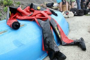 Ratownicy-nurkowie są wyposażeni w odpowiedni sprzęt do prac podwodnych. Przykładem mogą być tutaj suche skafandry klasy HD, które są dopuszczone do pracy również w wodach skażonych oraz specjalistyczne hełmy G2000SS, zwane potocznie hełmami Górskiego. Ich założenie wymaga pomocy kolegów. Wsparcie potrzebne jest także przy wejściu do wody i wyjściu z niej.