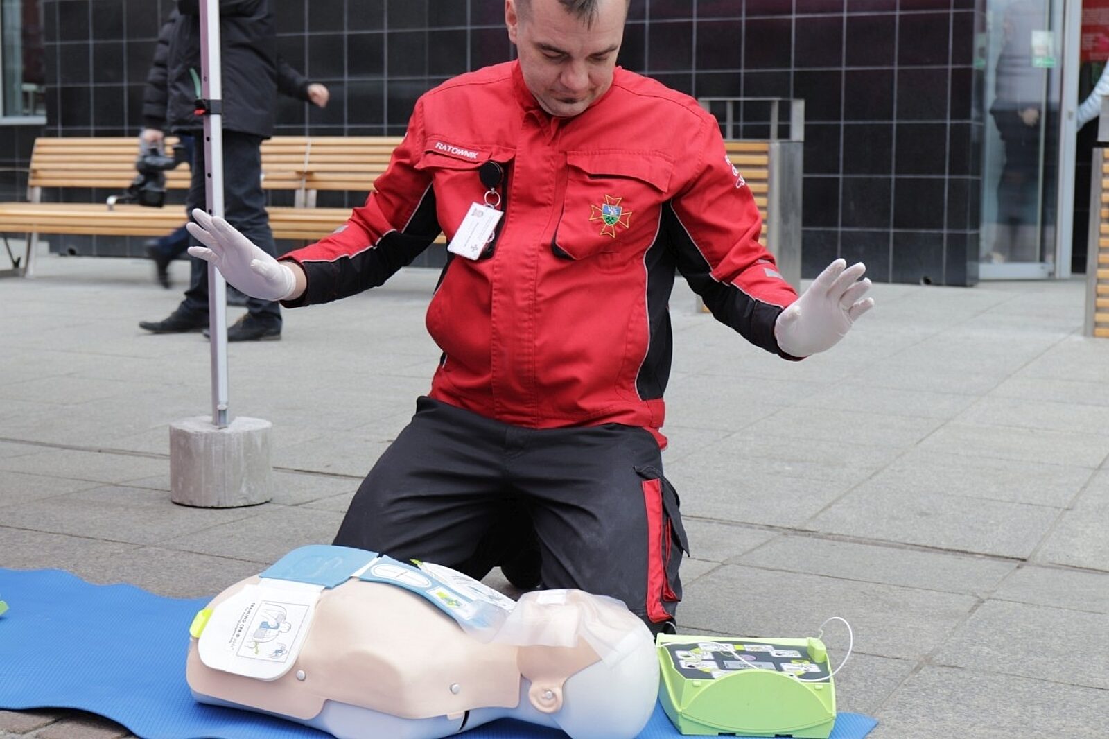 Ratownicy CSRG w Bytomiu demonstrowali na rynku w Katowicach użycie defibrylatorów AED ze spółki energetycznej Tauron