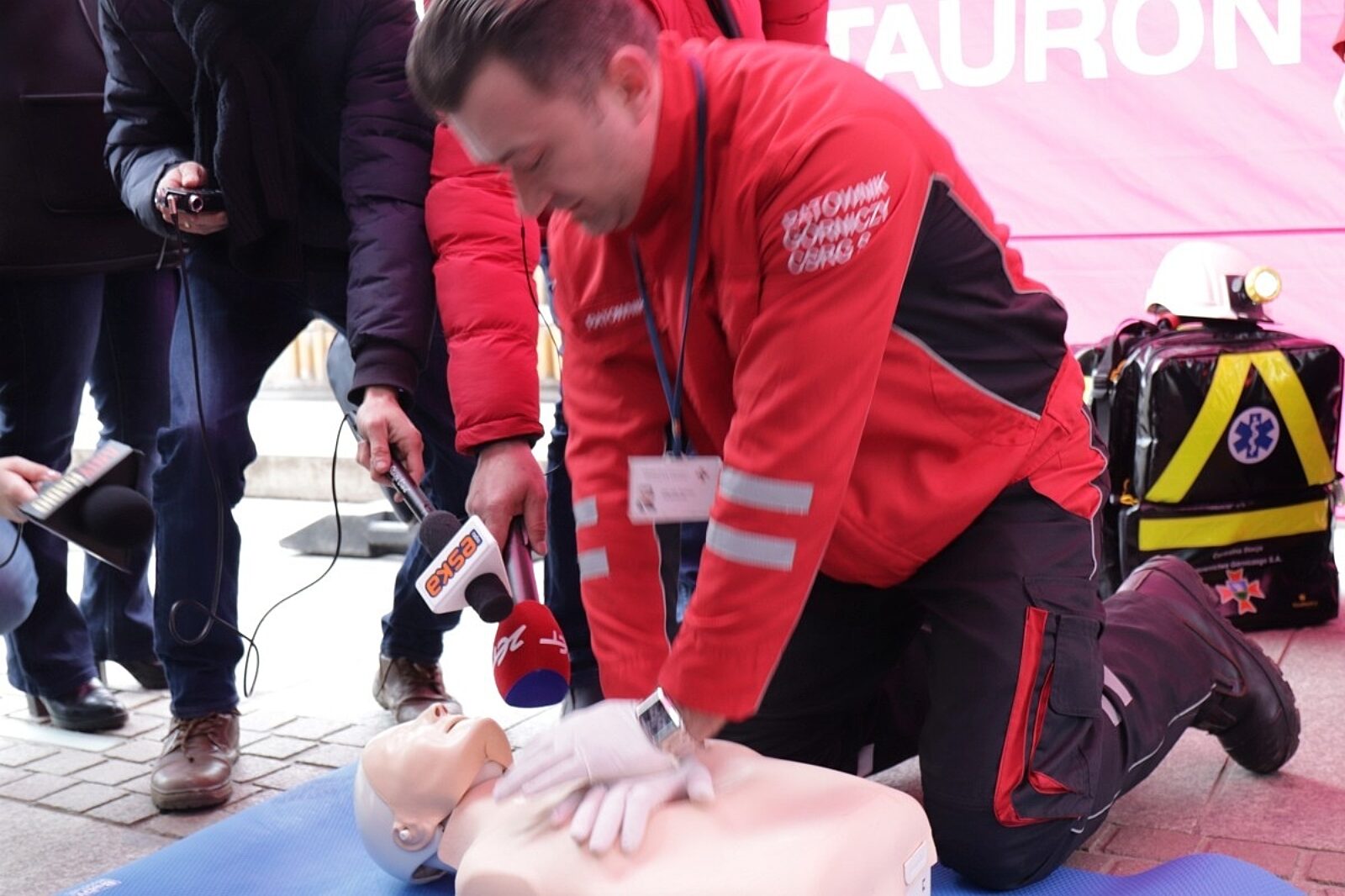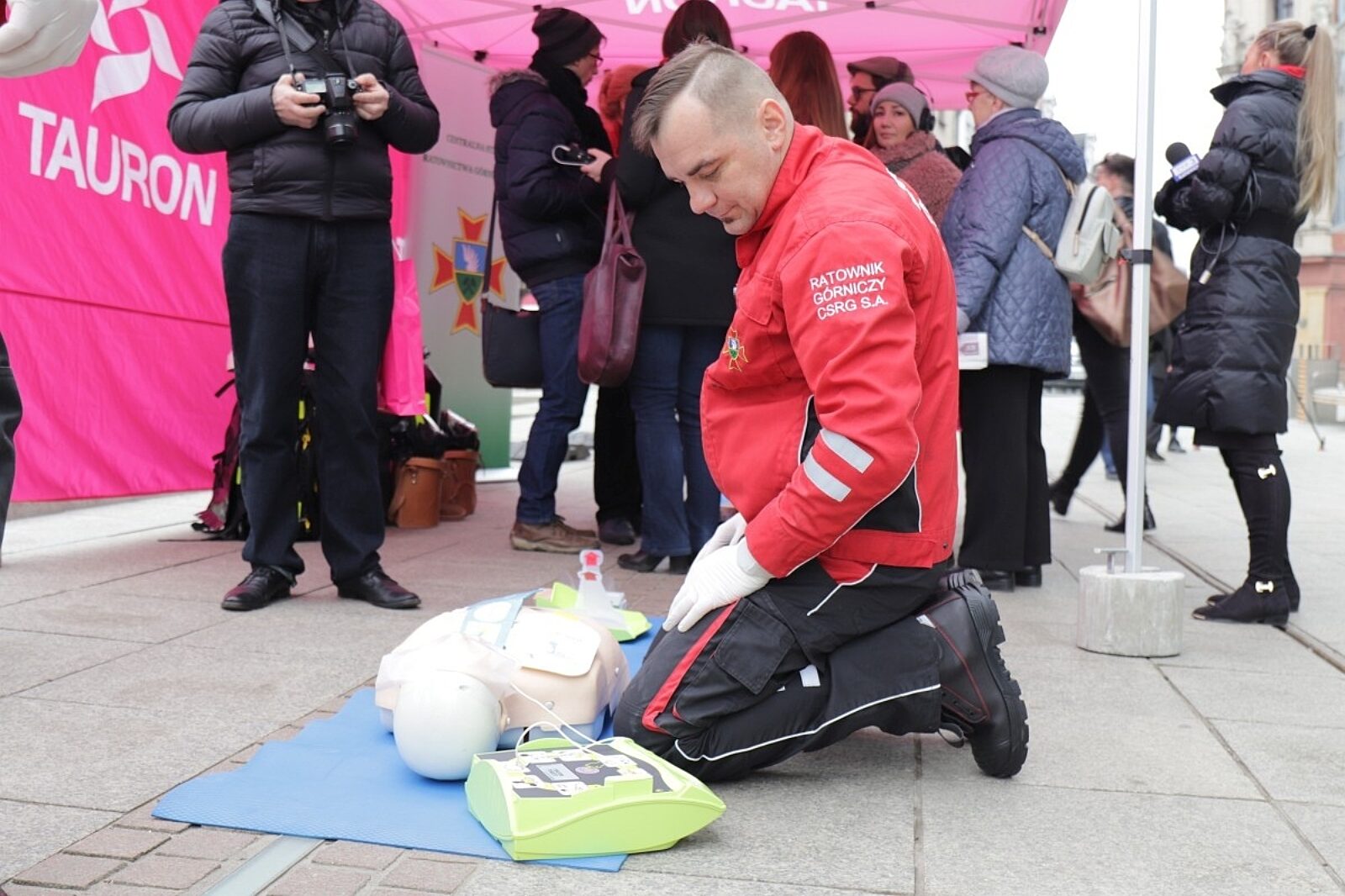 Ratownicy CSRG w Bytomiu demonstrowali na rynku w Katowicach użycie defibrylatorów AED ze spółki energetycznej Tauron