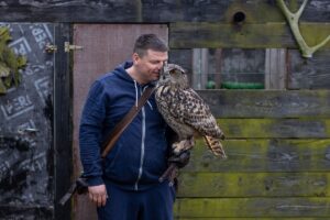 – Od małego ją wychowałem, łaziła po domu – opowiada. – Aby mieć kontakt z sową, trzeba ją od pisklaka wychowywać. Ferbuś, bo tak ma na imię sowa, ma pięć lat i grał nawet w reklamie kropli.