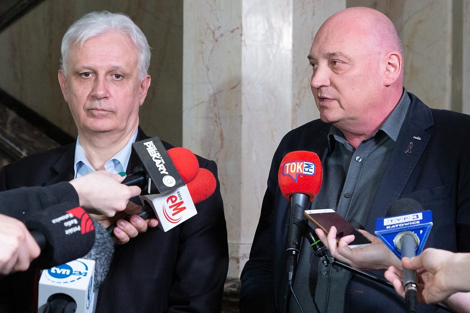 Dominik Kolorz i Jarosław Grzesik przedstawili dziennikarzom przebieg obrad Wojewódzkiej Rady Dialogu Społecznego z udziałem wicepremiera Jacka Sasina