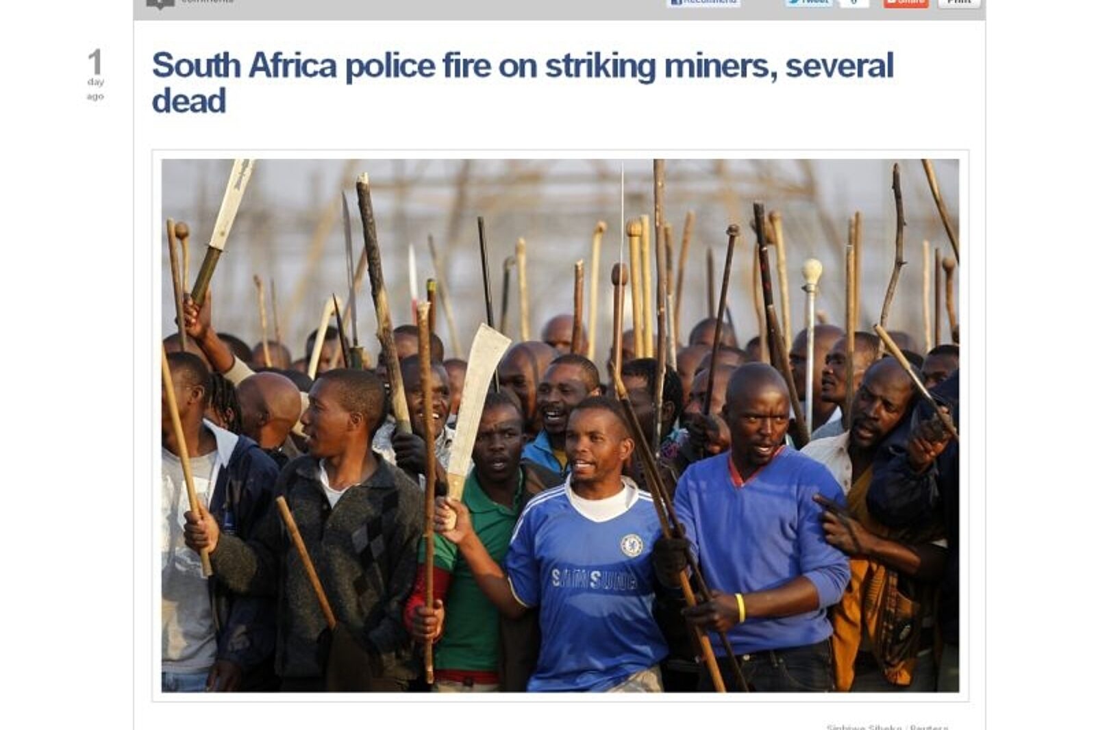Co najmniej 18 osób zginęło w Marikanie, w czwartek 17 sierpnia, kiedy południowoafrykańska policja otworzyła ogień do uzbrojonych w maczety i kije górników strajkujących w należącej do spółki Lonmin kopalni platyny Marikana, 100 km na północny zachód od Johannesburga.