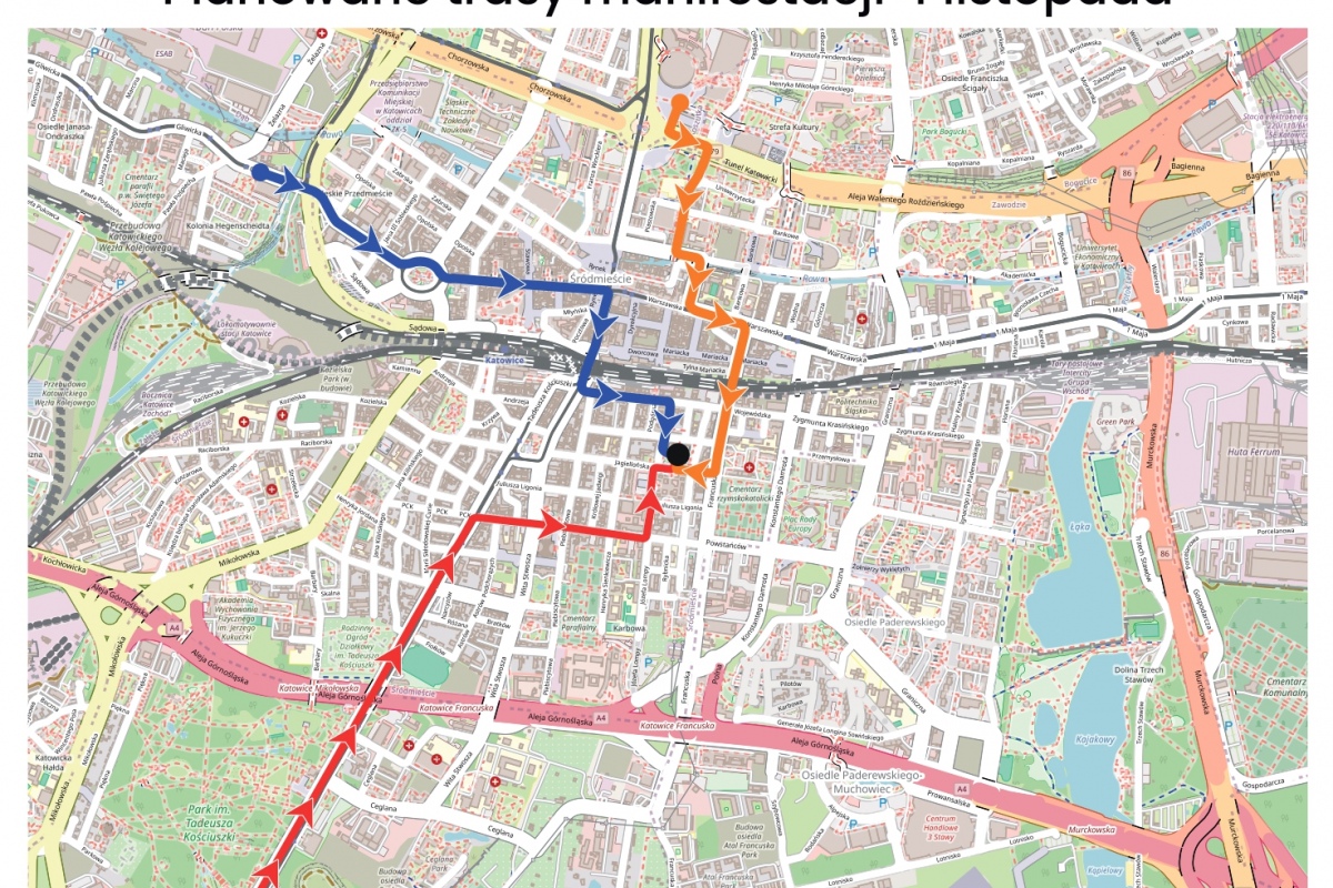 O 15.30 ruszyły trzy pochody - od Załęża, parku Kościuszki i Spodka przed Śląski Urząd Wojewódzki, gdzie ok. 17.00 spotkają się na półtoragodzinnej demonstracji. Kolumny manifestantów przemieszczają się przez ścisłe centrum Katowic.