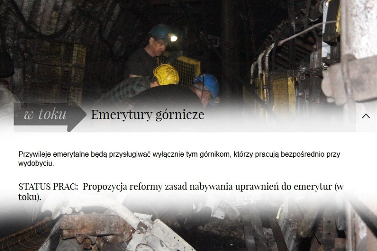 Na stronie internetowej kancelarii premiera nadal (17 kwietnia 2013 r.) widnieje informacja, że prace nad reformą zasad nabywania emerytur górniczych są "w toku".