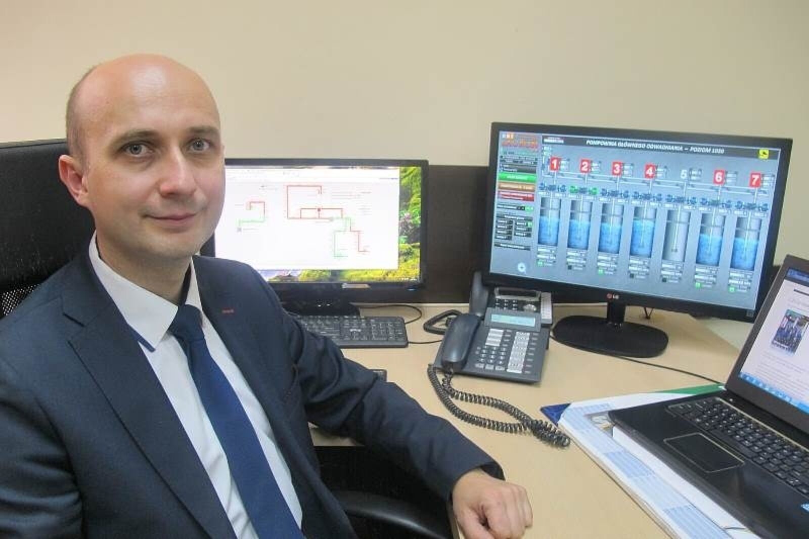 Nadsztygar Andrzej Wodarski prezentuje działanie systemu na monitorze w swoim biurze. Wyraźnie widać na nim rozdzielnie i pracujące pompy. System wyświetla ponadto niezbędne dane techniczne.