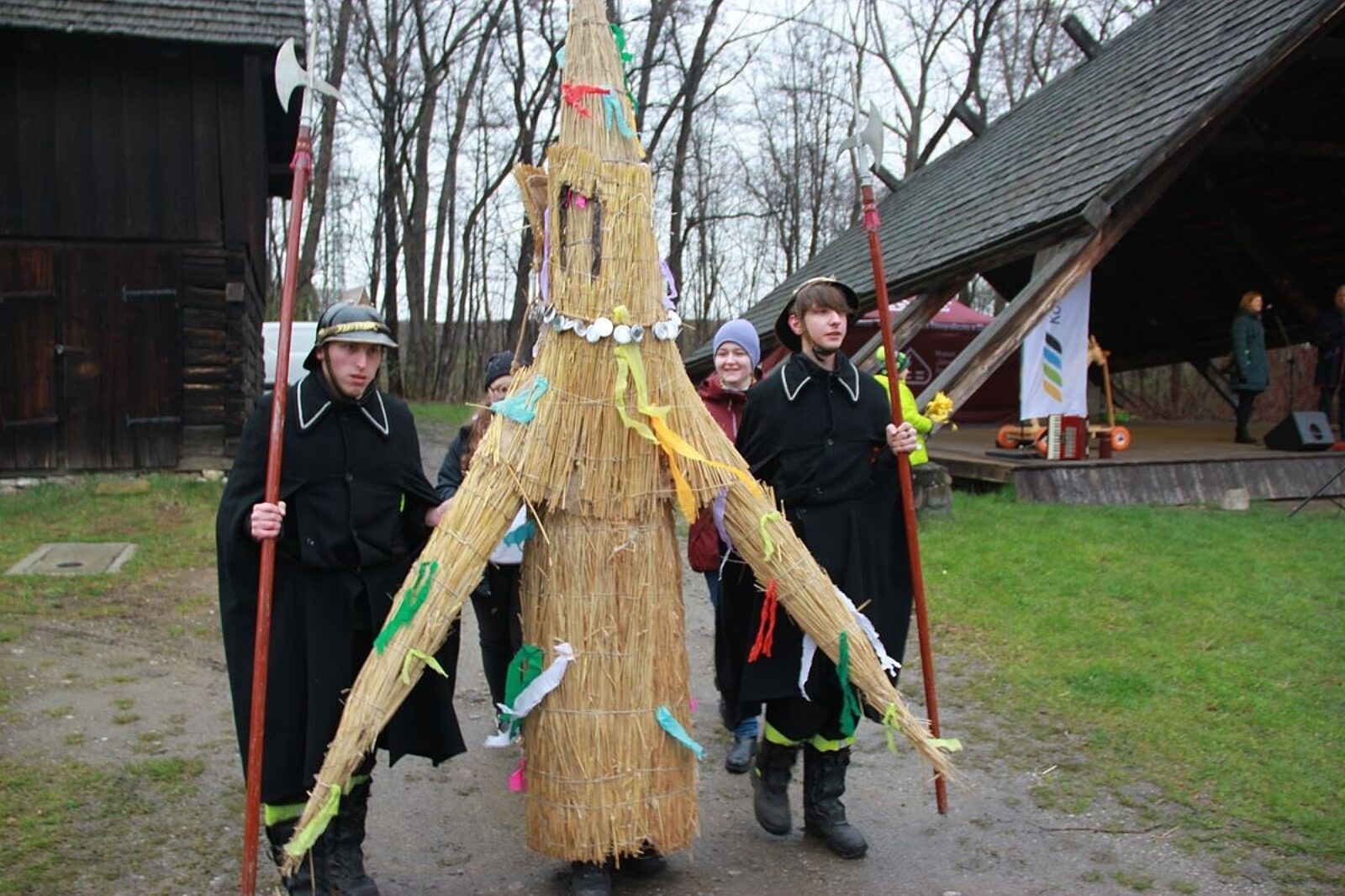 W Wielki Piątek i Sobotę w Skoczowie strażacy ochotnicy przebrani za żołnierzy rzymskich prowadzą Judasza ubranego w strój ze słomy