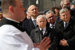 Po wystąpieniu lidera PiS rozpoczęło się składanie wieńcy pod tablicą.
