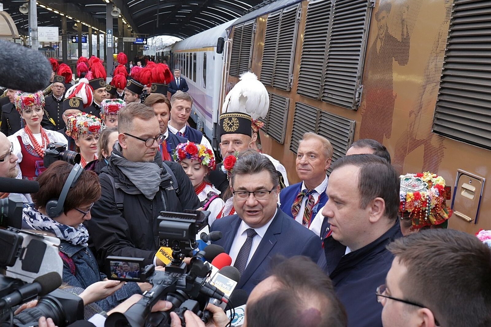 W pierwszym wagonie jadą m.in. wojewoda Jarosław Wieczorek, marszałek Jakub Chełstowski, wiceminister energii Grzegorz Tobiszowski, metropolita katowicki ks. abp Wiktor Skworc i inni reprezentanci elit Górnego Śląska. Górników reprezentuje m.in. wiceprezes Polskiej Grupy Górniczej Jerzy Janczewski.