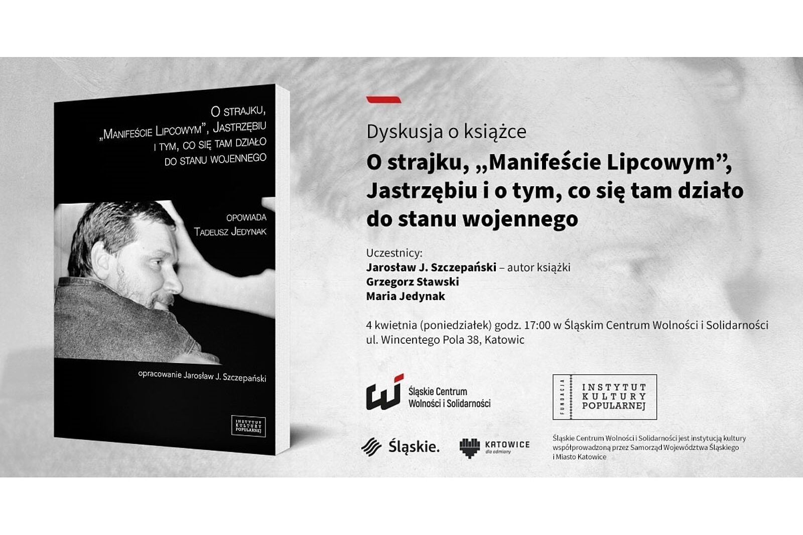 W poniedziałek, 4 kwietnia, o godz. 17.00 w Śląskim Centrum Wolności i Solidarności odbędzie się spotkanie z Jarosławem J. Szczepańskim, autorem książki „O strajku, Manifeście Lipcowym, Jastrzębiu i tym co się tam działo do stanu wojennego opowiada Tadeusz Jedynak”.