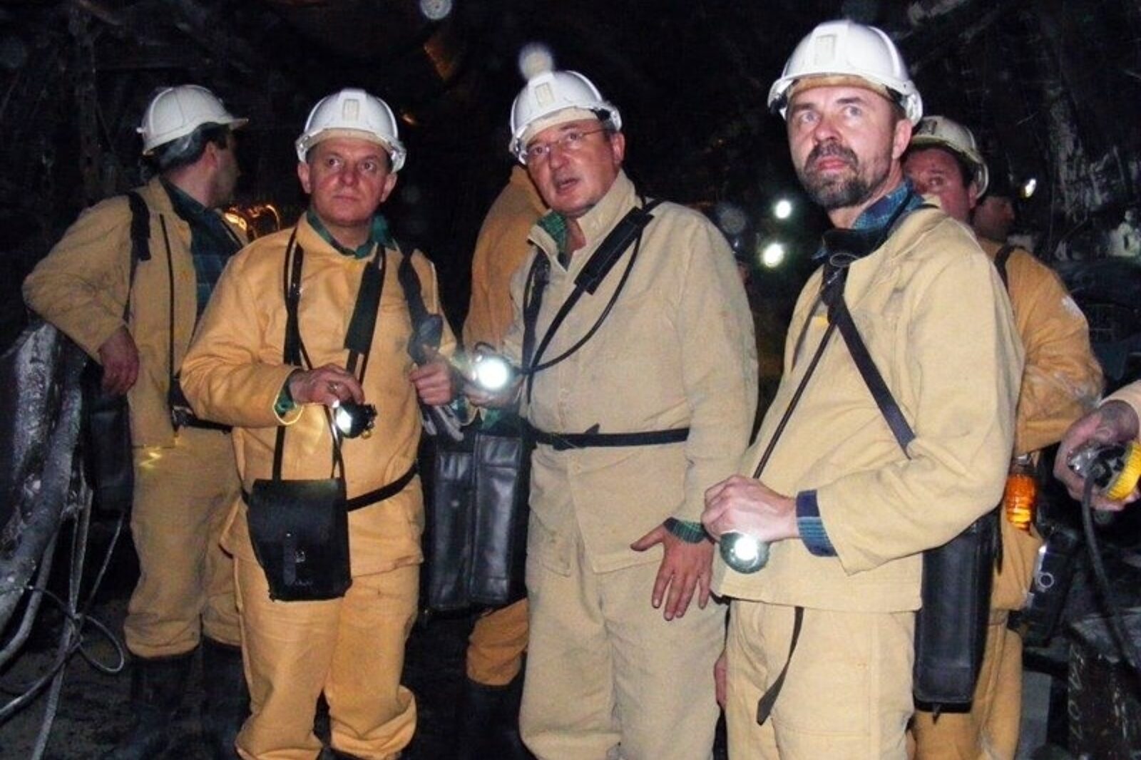 Wizyta duchownych w kopalni Bobrek. Od lewej stoją: ks. abp Mieczysław Mokrzycki, metropolita lwowski, Leonard Klabis, ówczesny dyrektor kopalni Bobrek, oraz ks. Konrad Krzyż, proboszcz parafii pw. Dobrego Pasterza w Bytomiu Karbiu