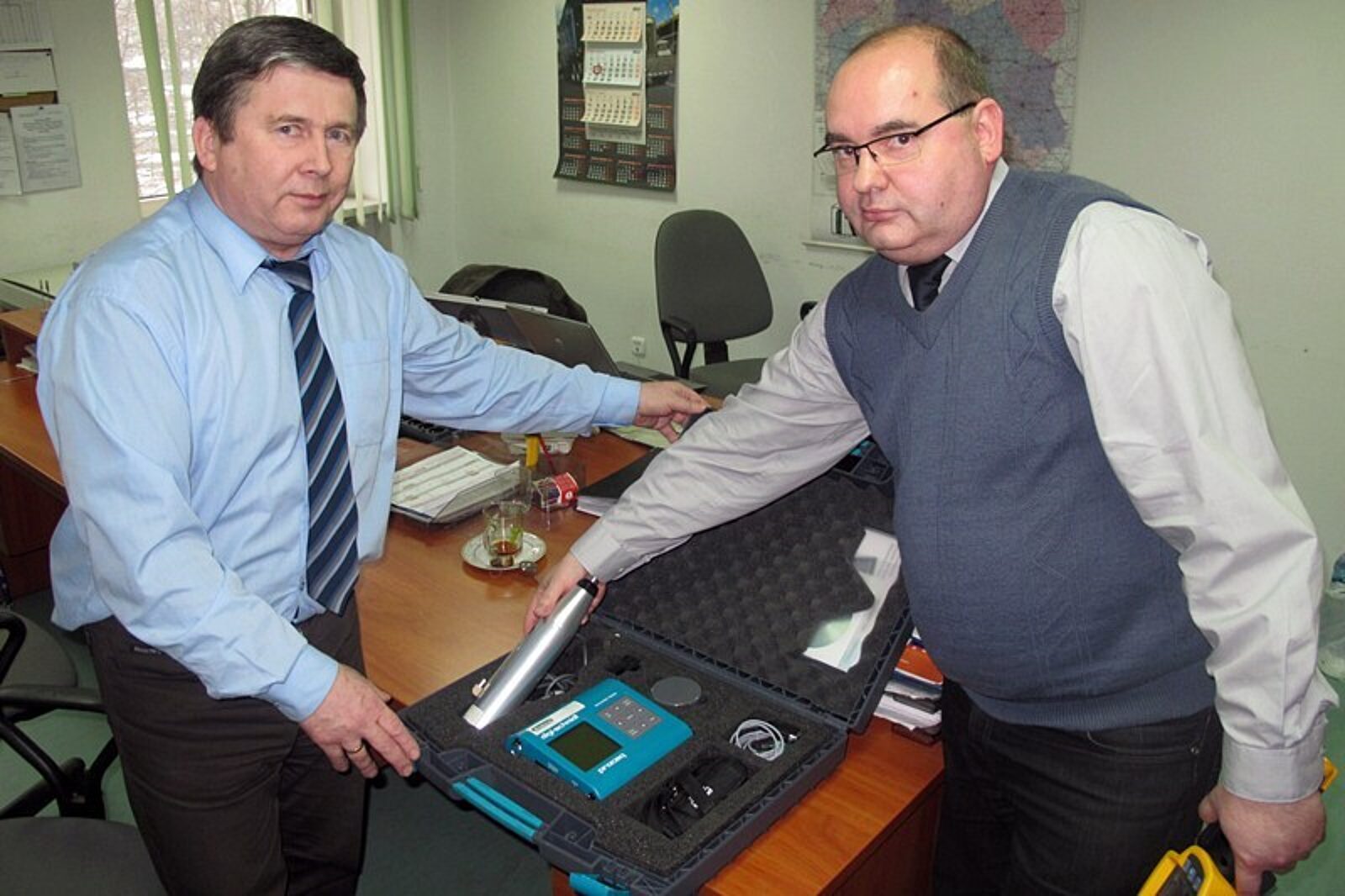 Tadeusz Bogacz i Marek Szczygieł, pracownicy Specjalistycznego Urzędu Górniczego, prezentują „podręczny" betonoskop