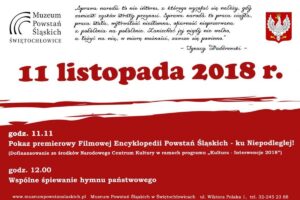 W obchody 100-lecia odzyskania przez Polskę niepodległości angażuje się m.in. Muzeum Powstań Śląskich w Świętochłowicach. Placówka przesłała do portalu netTG.pl harmonogram uroczystości, które zostaną tam zorganizowane 11 listopada. Na godzinę11.11 zaplanowano premierowy pokaz Filmowej Encyklopedii Powstań Śląskich – ku Niepodległej! Na godz. 12.00 wspólne odśpiewanie