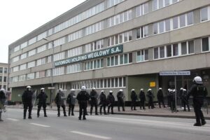 Do trzech lat więzienia grozi dwóm najagresywniejszym uczestnikom czwartkowych burd pod Katowickim Holdingiem Węglowym. Do aresztu policyjnego trafiło 9 mężczyzn, 6 z nich pod wpływem alkoholu - poinformował w piątek oficer prasowy Komendy Miejskiej Policji w Katowicach. Do ochrony budynku KHW przy ul. Damrota skierowano w czwartek funkcjonariuszy katowickiej komendy oraz Oddziałów