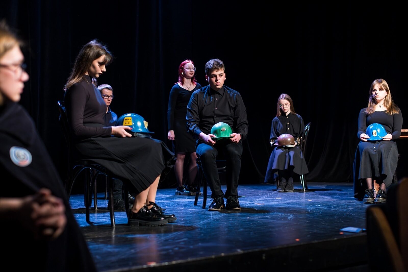Ważnym elementem scenografii są kaski, które twórcy spektaklu otrzymali od Śląskiego Centrum Wolności i Solidarności.