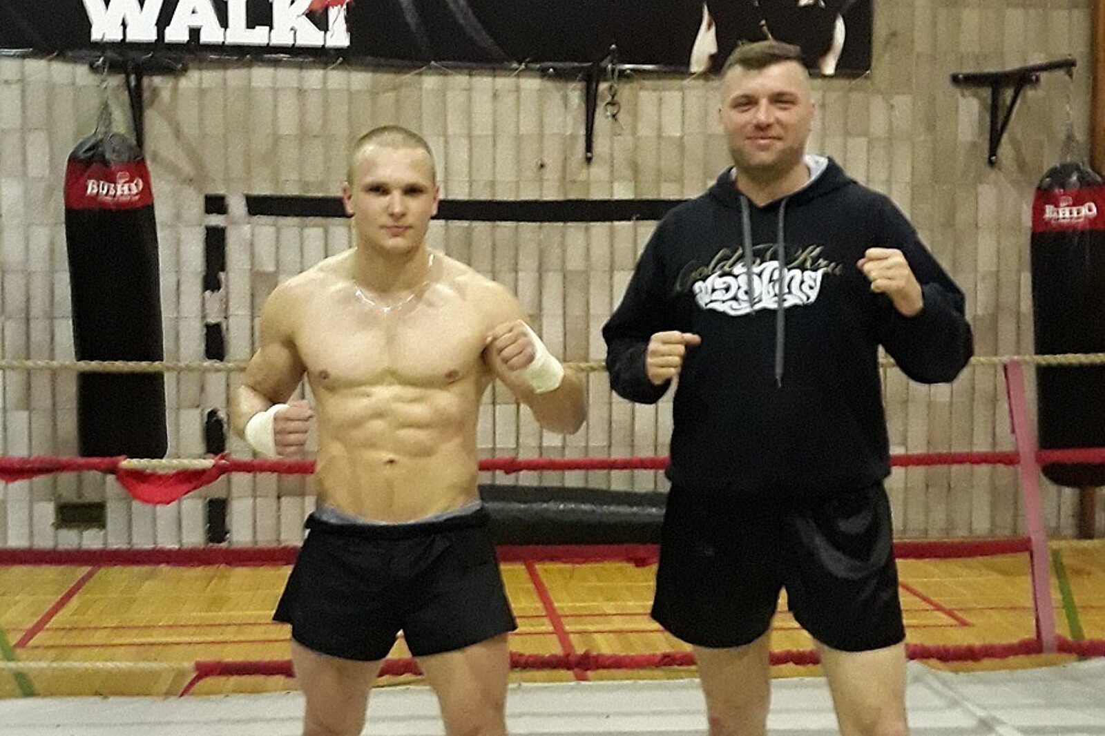 Adam Drosdek przygotowuje się do swej pierwszej zawodowej walki pod okiem trenera Sebastiana Szuta (z prawej) w klubie Ronin Tychy