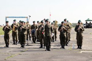 Żołnierze przygotowują się do defilady na terenie katowickiego lotniska Muchowiec
