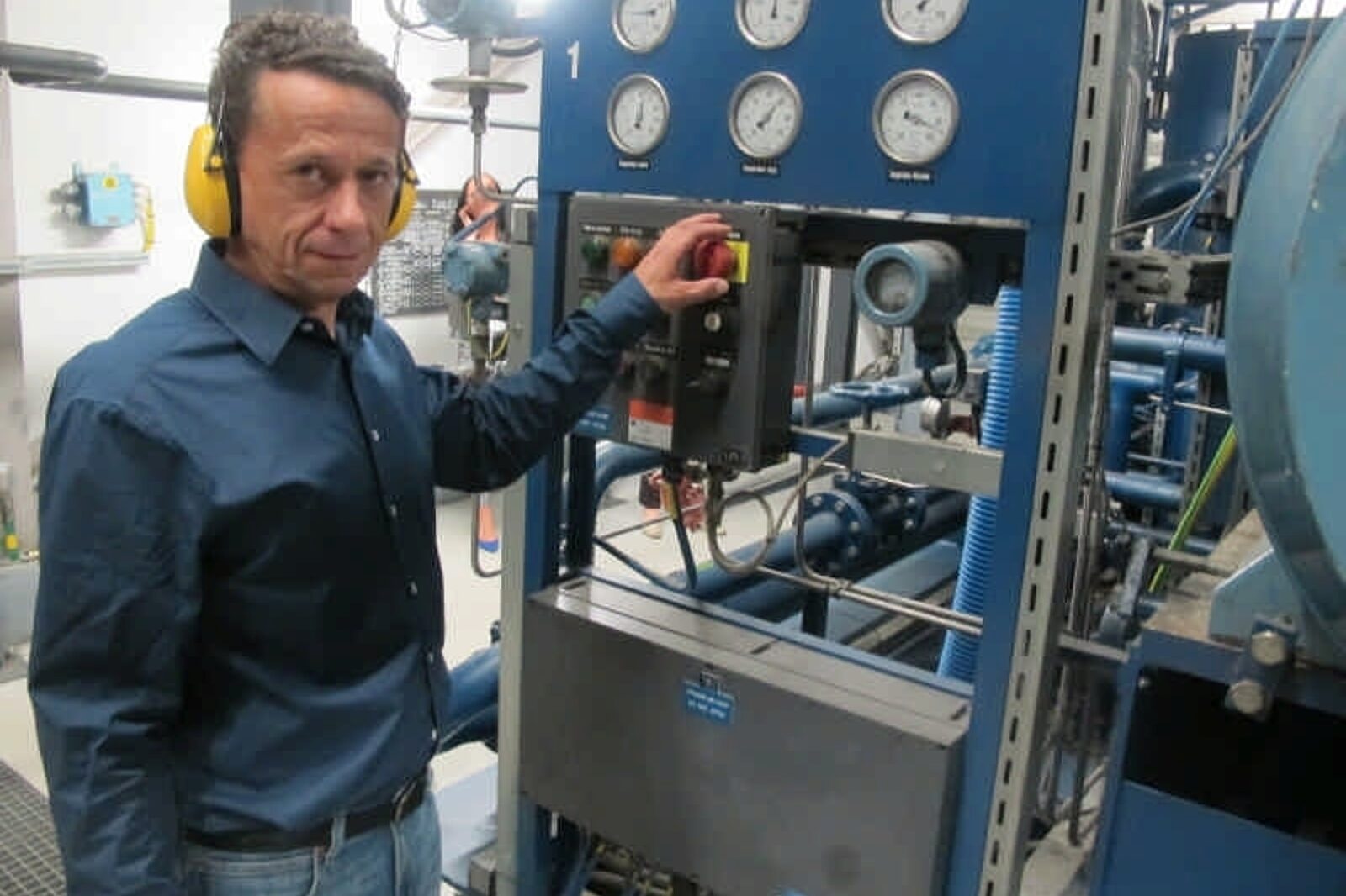 Sztygar zmianowy Dariusz Wieczorek prezentuje urządzenia zainstalowane w stacji odmetanowania kopalni Brzeszcze.
