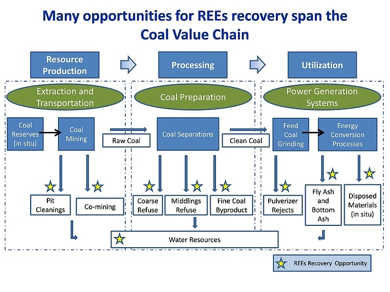Na rysunku gwiazdkami oznaczono możliwość odzysku PZRz w różnych miejscach łańcucha wartość węgla od wydobycia, przez przeróbkę po spalanie w elektrowniach (źródło NETL)