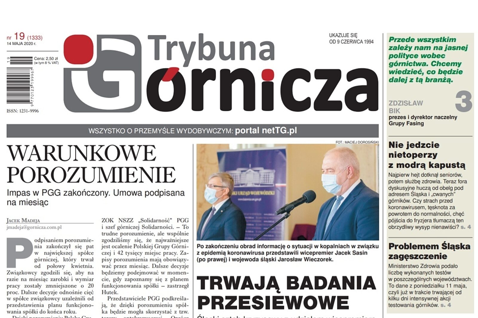 Najbliższy numer Górniczej - który do rąk Czytelników oddamy w czwartek, 14 maja – będzie dotyczył przede wszystkim sytuacji w kopalniach, które na szeroką skalę dotknęła epidemia koronawirusa. Wzrost zachorowań na Ślasku spowodował falę hejtu, która spadła na region i na górników. Ponadto przyjrzymy się sytuacji firm okołogórniczych, które także znacząco odczuwają trwający kryzys. Przedstawimy także porozumienie, które zawarł zarząd Polskiej Grupy Górniczej ze związkami zawodowymi oraz relacje z wizyty wicepremiera Jacka Sasina na Śląsku, który uczestniczył w posiedzeniu śląskiego sztabu kryzysowego.