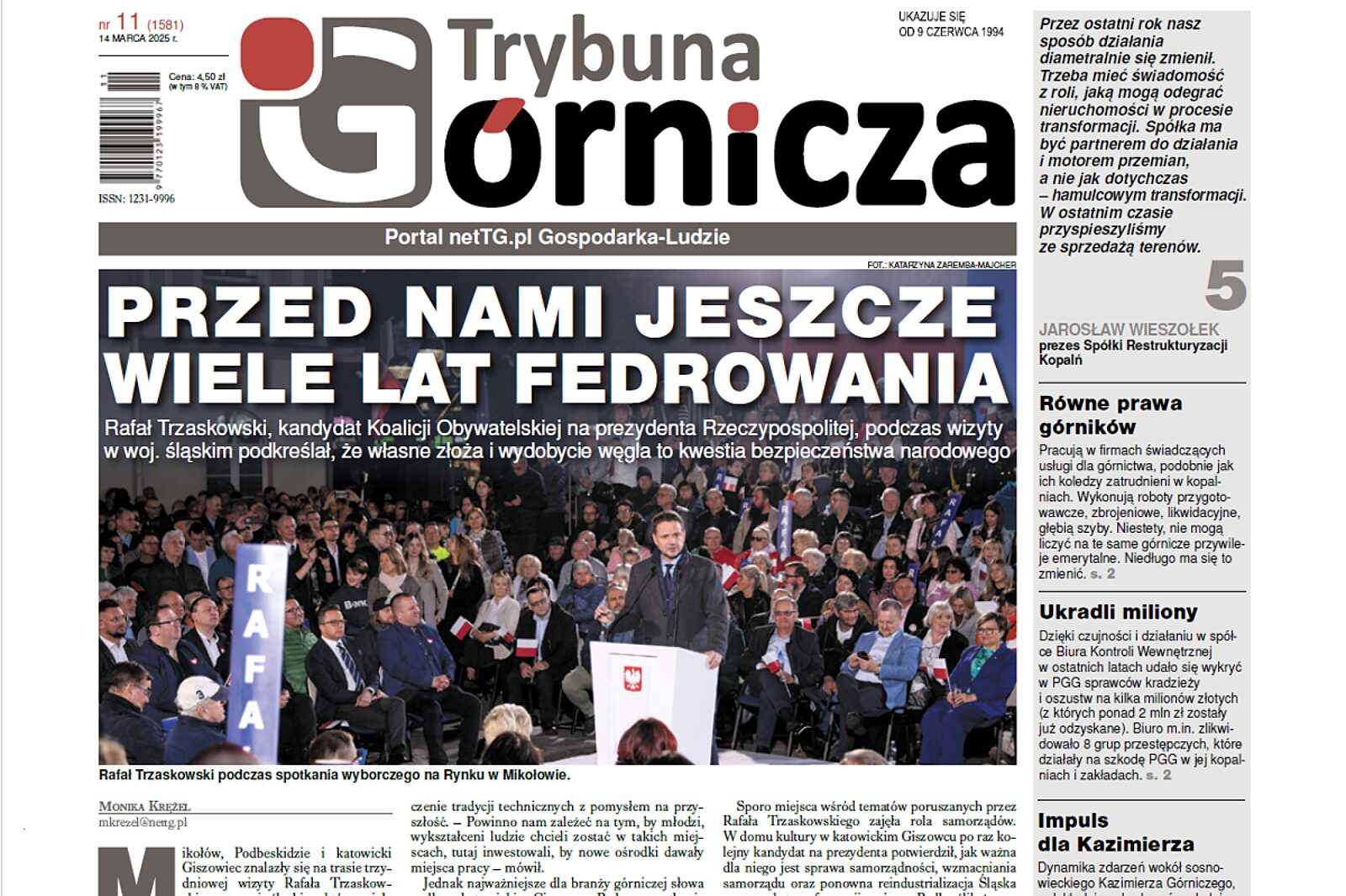 W tym wydaniu Trybuny Górniczej przedstawiamy relację z wizyty w woj. śląskim Rafała Trzaskowskiego, kandydata Koalicji Obywatelskiej na prezydenta Polski, który podkreślał, że własne złoża i wydobycie węgla to kwestia bezpieczeństwa narodowego, szczególnie dzisiaj w dobie niezwykle dynamicznej sytuacji geopolityczne. Podczas spotkania w katowickim Giszowcu poruszone zostały kwestie związane z przyszłością górnictwa i procesem transformacji regionu. „Przed nami jeszcze wiele lat fedrowania” to materiał z pierwszej strony najnowszego wydania naszego tygodnika. O najważniejszych sprawach dla Śląska, jak węgiel, transformacja i umowa społeczna Rafał Trzaskowski mówi także w krótkim wywiadzie zatytułowanym „Umowa społeczna to śląska racja stanu”.