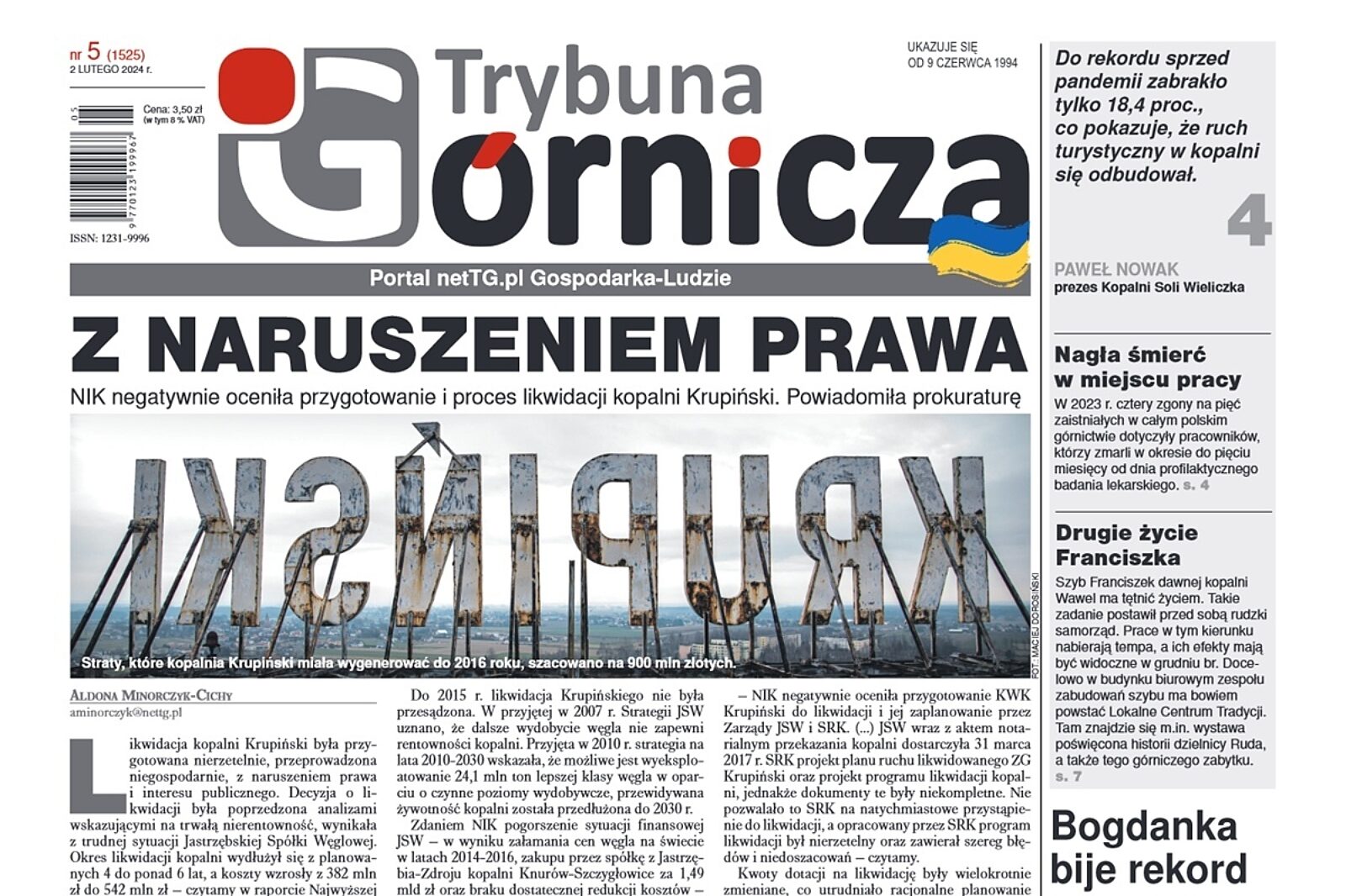 Najwyższa Izba Kontroli przyjrzała się likwidacji kopalni Krupiński – ten temat otwiera nowe wydanie Górniczej, który do rąk Czytelników oddamy w piątek, 2 lutego. Ponadto omawiamy przebieg spotkania minister przemysłu prof. Marzeny Czarneckiej z górniczymi związkami zawodowymi.
