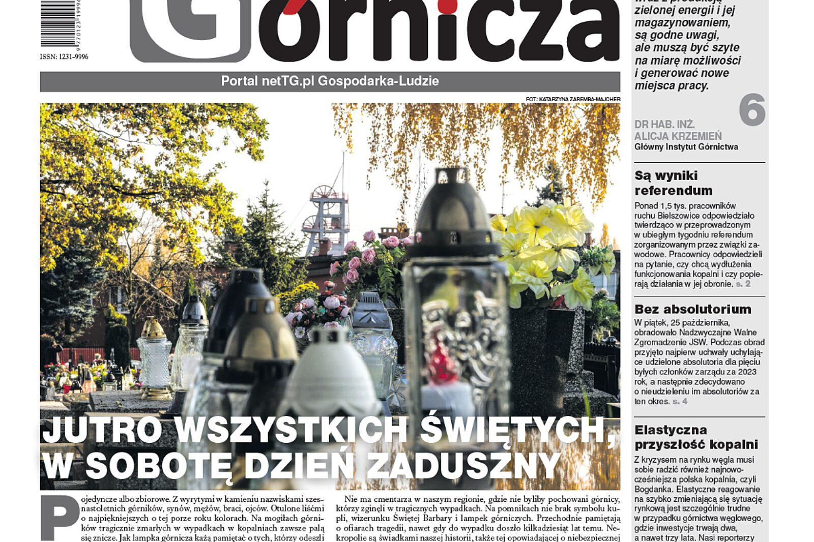 Najbliższe wydanie „Górniczej”, ze względu na dzień Wszystkich Świętych, do rąk Czytelników dotrze już w czwartek 31 października. Pamięci górników poległych w katastrofach poświęcamy główny materiał tego numeru. Ponadto przedstawiamy relację i fotoreportaż z kopalni Bogdanka, którą odwiedzili nasi reporterzy, piszemy o referendum w ruchu Bielszowice, porównujemy także restrukturyzację po obu stronach naszej południowej granicy.