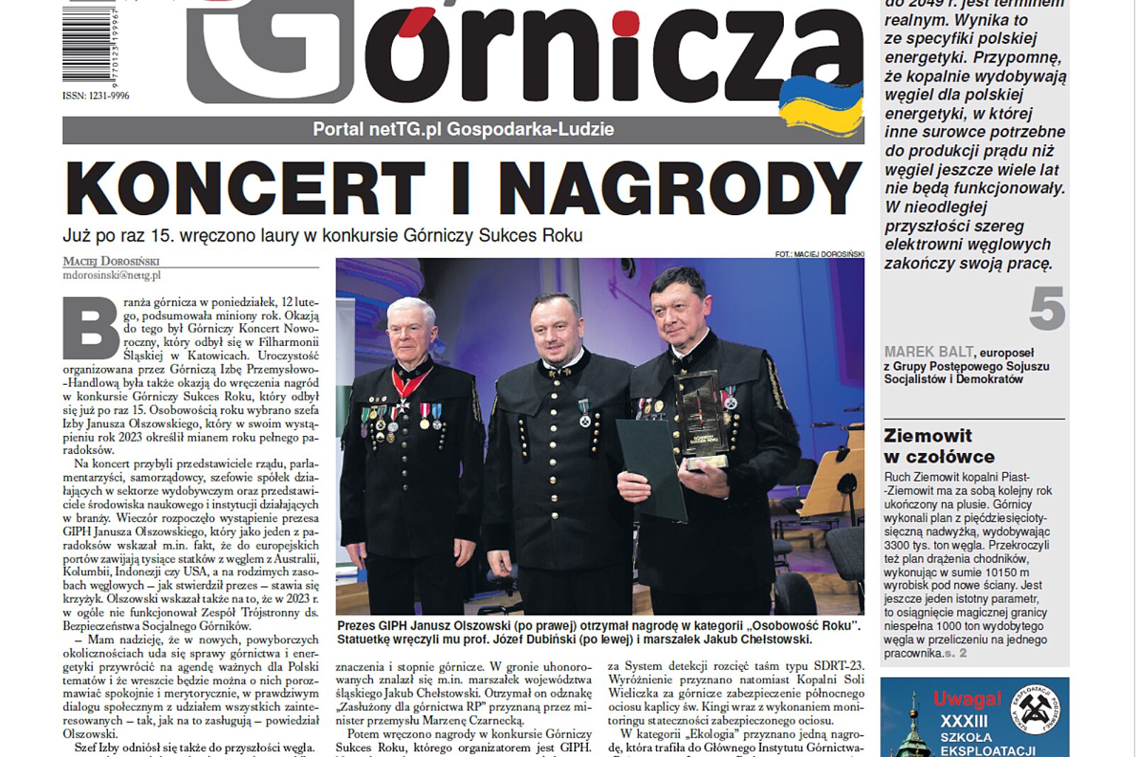 Branża górnicza w poniedziałek, 12 lutego, podsumowała miniony rok. Okazją do tego był Górniczy Koncert Noworoczny, który odbył się w Filharmonii Śląskiej w Katowicach. Uroczystość organizowana przez Górniczą Izbę Przemysłowo-Handlową była także okazją do wręczenia nagród w konkursie Górniczy Sukces Roku, który odbył się już po raz 15. O szczegółach i o tym, kto został laureatem konkursu nasi czytelnicy mogą przeczytać w artykule otwarciowym pt. „Koncert i nagrody”.