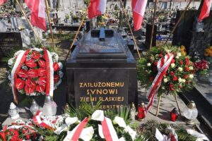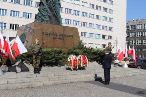 Wieńce pod pomnikiem złożyli m.in. wojewoda śląski Jarosław Wieczorek, marszałek województwa Jakub Chełstowski, prezydent Katowic Marcin Krupa i wiceprezydent Mariusz Skiba.