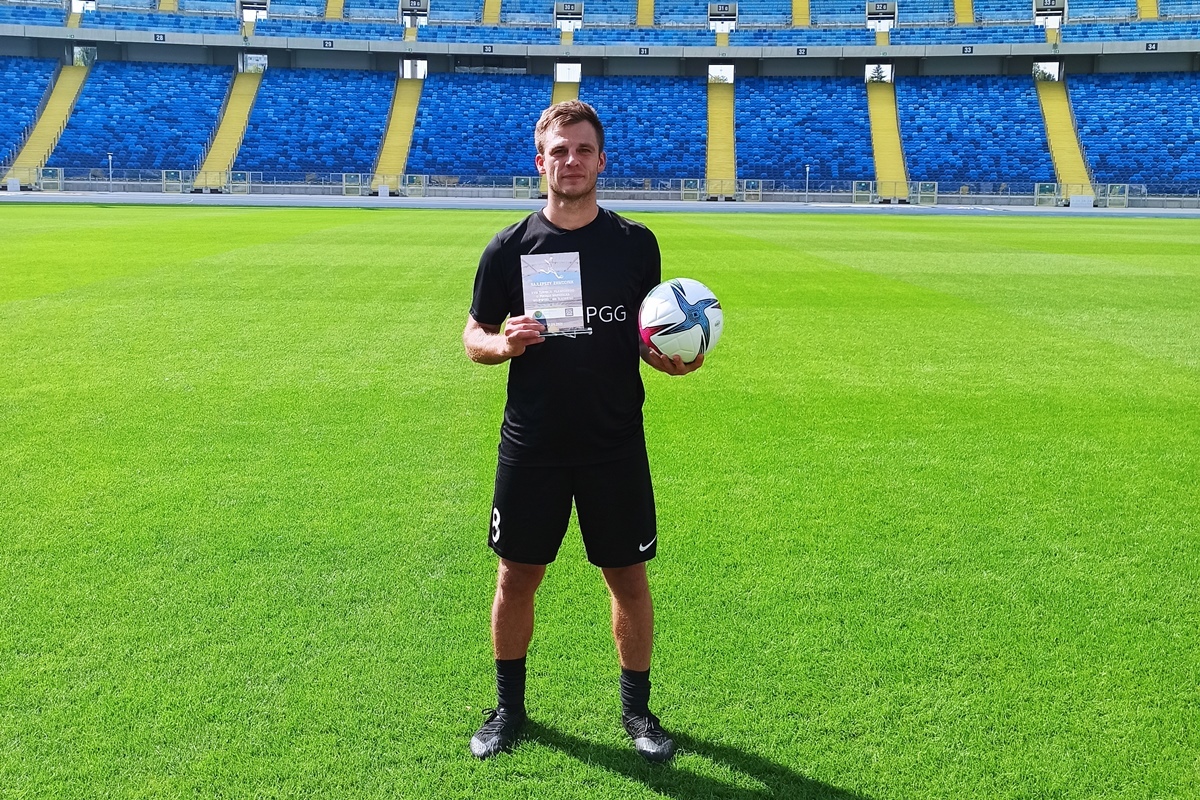 Łukasz Kopytko na murawie Kotła Czarownic tuż po zwycięstwie drużyny PGG w meczu finałowym o Puchar Marszałka Województwa Śląskiego. Zdj. Dawid Buffi/ARC