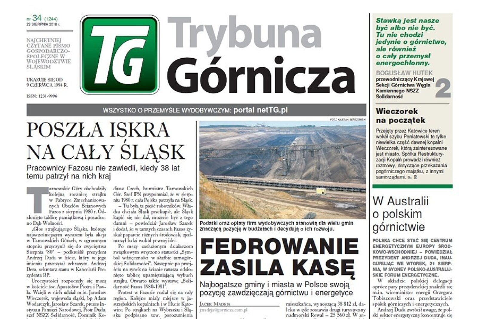 W 34. numerze TG jak co tydzień przybliżamy najnowsze wiadomości ze świata branży górniczej i branż pokrewnych. Przypominamy też ważne zdarzenia historyczne takie jak np. kolejna rocznica strajku w Fabryce zmechanizowanych Obudów Ścianowych Fazos z sierpnia 1980 r.