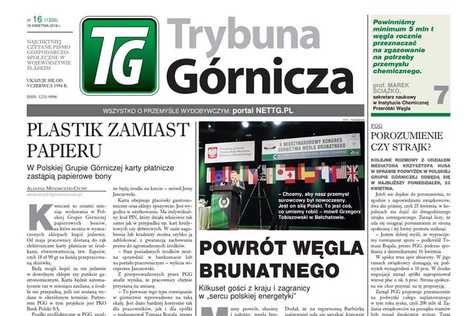 W czwartek, 19 kwietnia, ukaże się najnowszy numer Trybuny Górniczej. W tym wydaniu sporo miejsca poświęcamy Polskiej Grupie Górniczej, która przedstawiła wyniki finansowe za 2017 r. Nowością dla pracowników PGG będą flapsy w postaci nie bonów, ale kart elektronicznych. O tym rozwiązaniu także można przeczytać w nowym wydaniu naszego tygodnika. Ponadto przedstawiamy relacje z „serca polskiej energetyki”, czyli Bełchatowa, gdzie odbył się X Międzynarodowy Kongres Górnictwa Węgla Brunatnego. Uczestniczył w nim m.in. wiceminister energii Grzegorz Tobiszowski.