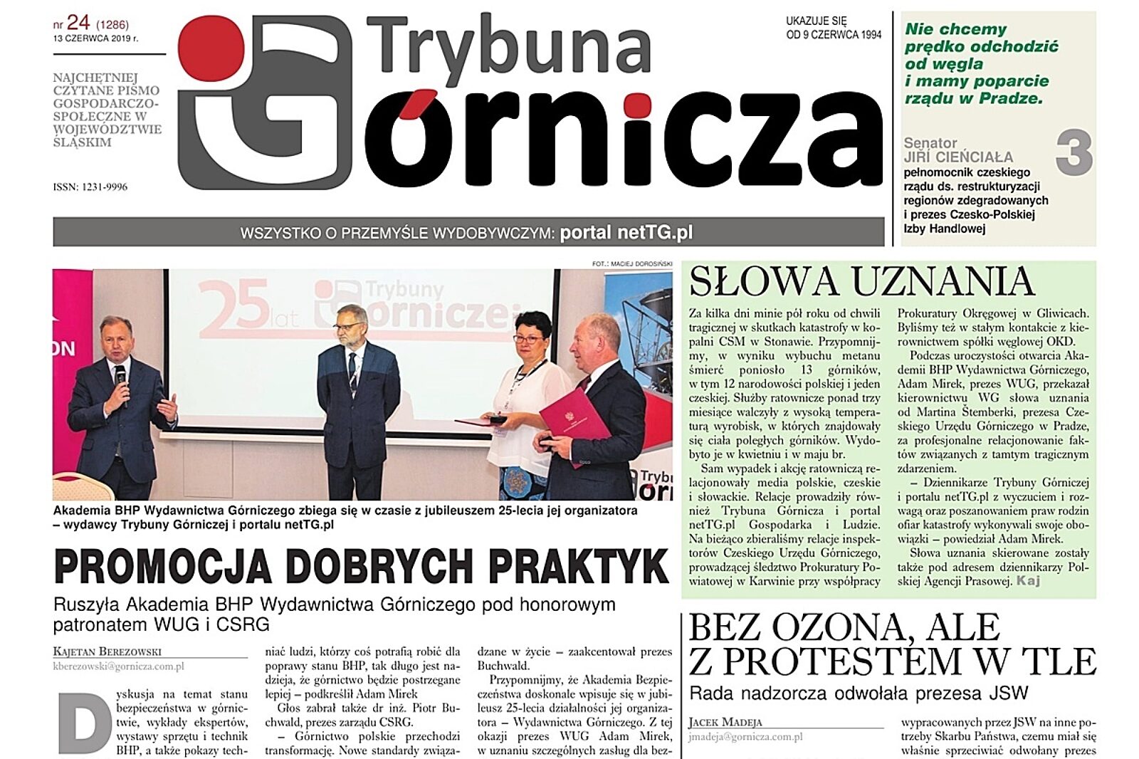 Wiodącym tematem czwartkowego wydania Trybuny Górniczej jest inauguracja Akademii BHP Wydawnictwa Górniczego oraz odwołanie Daniela Ozona ze stanowiska prezesa Jastrzębskiej Spółki Węglowej - "Bez Ozona, ale z protestem w tle".